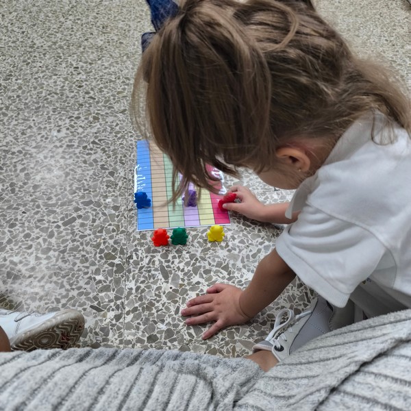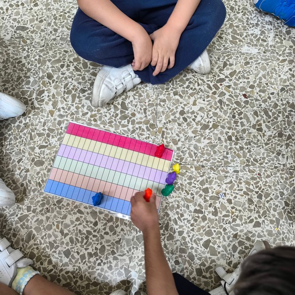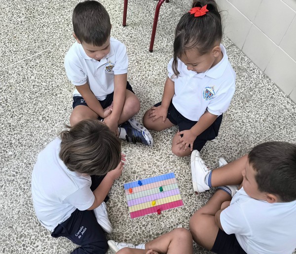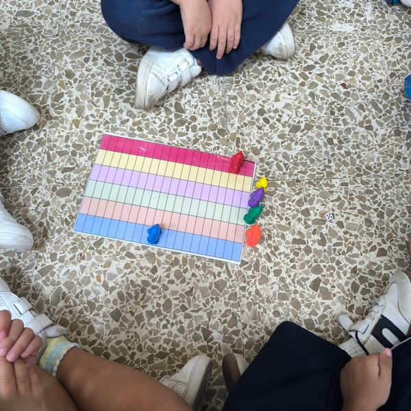 Con este juego por equipos de pequeños grupo diferentes a los equipos de rincones y a los de mesa, trabajamos de forma lúdica el conteo, el respeto a los turnos de participación tirando los dados y contando las casillas para ver quién finaliza primero el camino de baldosas de colores.